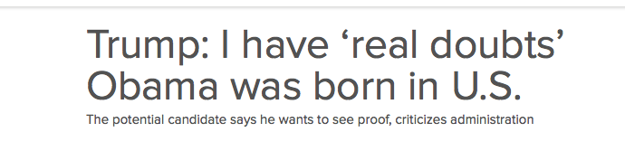 Hillary is the villain. From 2011 through today birtherism was a Trump signature cause, and for two years it was the primary idea presented by Trump to the media, only being displaced by immigration when Trump announced the start of his campaign in August, 2015. In 2008, during the Clinton/Obama primary fight some chain emails were re-sent by Hillary supporters (not Hillary and not her campaign) who passed along a rumor going back to a 2004. Hillary Clinton was asked about this by reporters in 2008 and said she did not agree with the rumored allegation. He was an American born in Hawaii, she said, and a Christian, not a Muslim. Trump brought the issue back to the surface in 2011. The campaign statement repeatedly attributes the "ugly incident" to Hillary. This morning's story on Fox News had a screen crawl which stated as fact that the issue was raised by Hillary, not Trump.