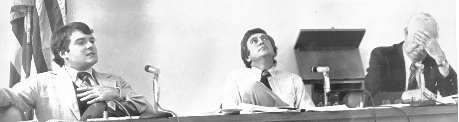 The photo was the entire top half of the front page of the Ashland Daily Tidings. The photo got photocopied and circulated. Five years afterwards I saw a clipping of this photo displayed on the office door of a journalism professor at the local university. That is me, speaking on the left. In the middle is Jon Deason. On the right is Don Schofield.