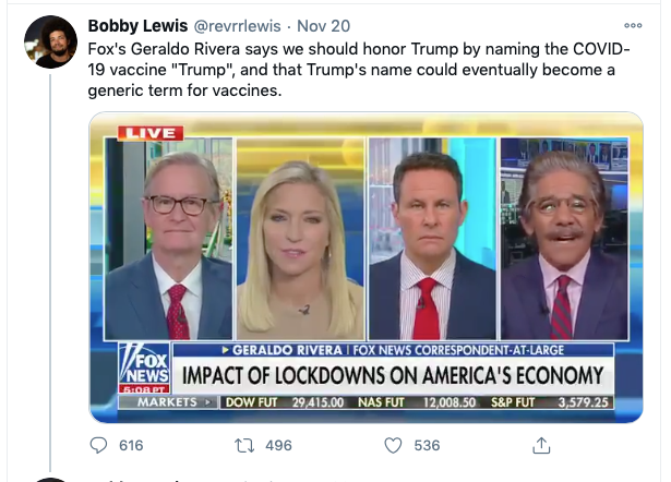 Meanwhile, Trump says that he is responsible for creating the vaccine. That is what people should associate with Trump. Fox News host Geraldo Rivera says it should be named after Trump.