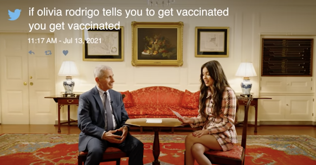 I share the video to make two small points. One is to show how awkward and pointless some political messages can be. The video is cringe-worthy. It is worse than worthless. Dr. Fauci, who can be persuasive to many people when he is solidly in-character as an earnest physician and immunologist, looks like a fish out of water here with Rodrigo. He looks like a good actor pretending to be a bad one delivering lines in a stilted way--or a man genuinely uncomfortable; no doubt the latter. Rodrigo makes scripted pleasantries with forced chuckles. Not all publicity is good publicity, but fortunately hardly anyone watched--only 37,000 views on YouTube. This isn't how she communicated with her age cohort. That was by TikTok and Instagram, where it was just her being herself.
