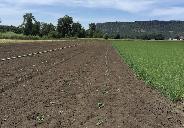 The work with small equipment is a very different experience. Melons are planted in spaced "hills" about 30 inches apart, positioned in rows. The solid-looking rows in the June photos below are plants that have grown together.